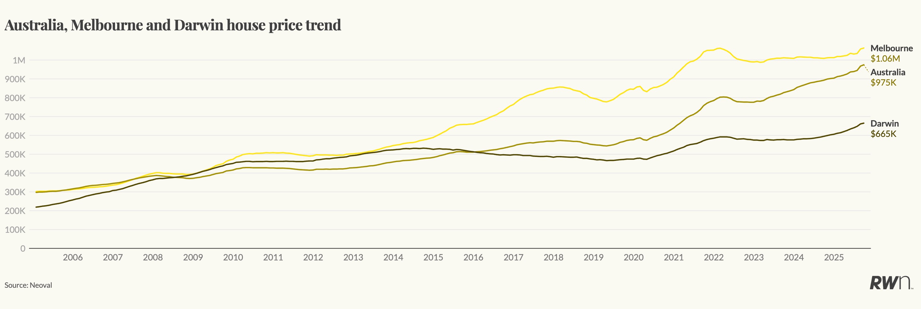 The broader trend data also reinforce how the two markets have diverged and converged over time. Melbourne remains well above its long-term trajectory, with a current median house price of around $1.06 million, while Darwin, at $665,000, is still below its 2014 peak but clearly regaining lost ground. The narrowing gap visible in long-run price trends shows how the national recovery is now spreading to the markets that were slowest to move.